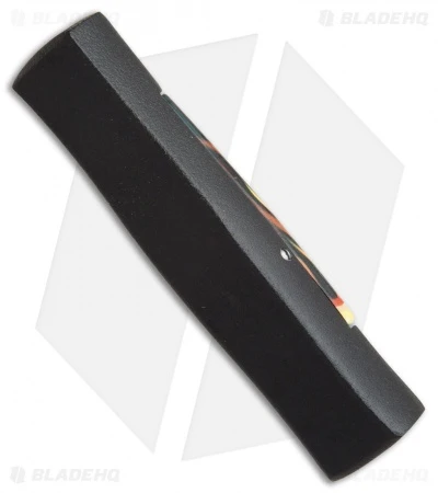 This model features a black finished, flat ground spear point blade and a black aluminum handle with a Flame acrylic insert.