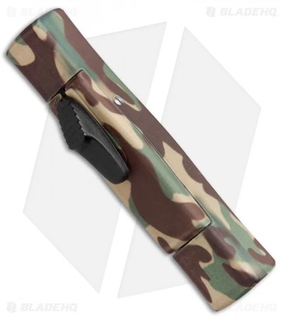 This Minion model features a gold finished, flat ground spear point blade and a green camo aluminum handle.