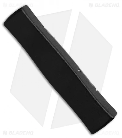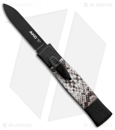 This model features a black finished, flat ground spear point blade and a black aluminum handle with a Snake Skin pattern acrylic insert.