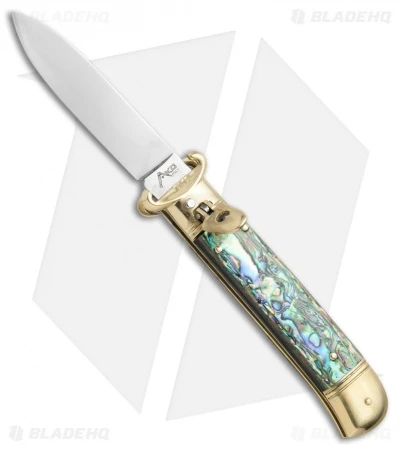 This 8″ Italian Stiletto from AKC comes in the Lever Lock Shot Puller style with an abalone handle, brass bolsters, and a flat grind blade. AKC specializes in collectible Italian stilettos made with traditional knife-making techniques. This 8″ Lever Lock model has a cocobolo handle with a sturdy stainless steel liner. Brass pins and liners add a classic finishing touch to the design. The blade comes in a dagger style with a plain edge and a polished finish. Add classic Italian style to your collection with the AKC 8″ Lever Lock stiletto.